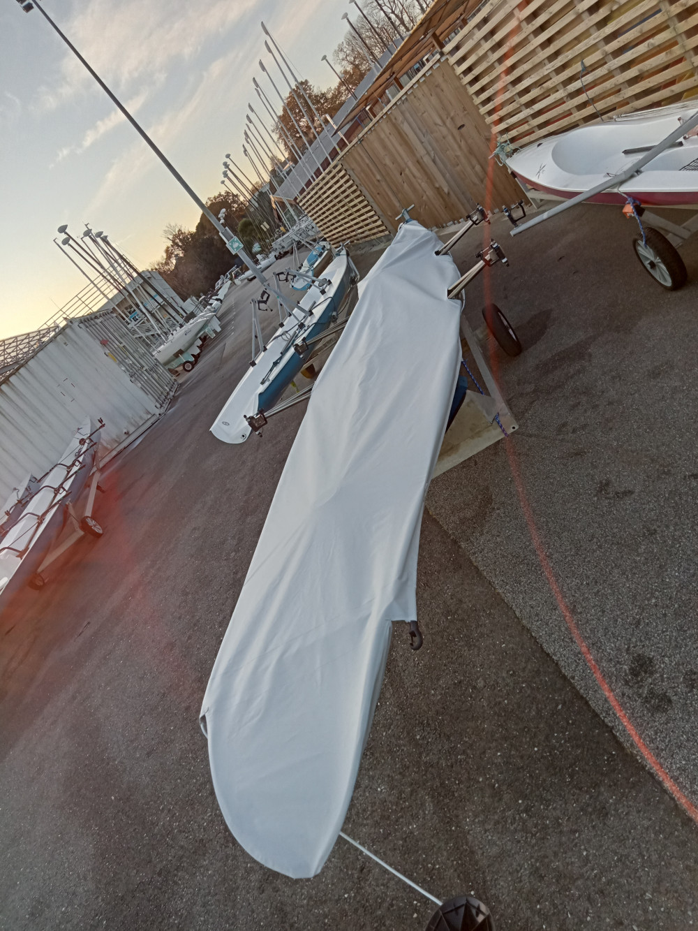 Confection d'une housse de protection pour une yole 2 places, stamoid light gris clair, facile à manipuler, stocker, léger et peu d'entretien. Bien sûr respirant et résistant. Passage libre pour les fixations de rames, tubes extensibles pour éviter les poches d'eau, sandow mer de serrage autour et sangles boucles pour l'envolée!!!